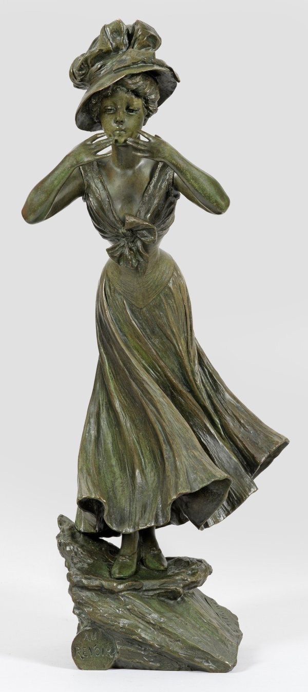 Bronze, dunkelgrün patiniert. Sign. u. am Sockel betitelt. In zwei Teilen gegossene, selten ausgeführte, vollplastische Darstellung einer jungen, eleganten Dame der Belle Epoque mit Hut, auf einem Felsen stehend und in vorgebeugter Haltung mit Abschiedsgeste. Villanis gehört zu den bedeutendsten und schaffenreichsten Bildhauern des französischen Art Nouveau. 1870 ging Villanis nach Turin, wo er 1871-1880 an der Akademie -vornehmlich bei Odoardo Tabacchi (1831 - 1905) studierte. 1881-1885 beschickte Villanis zahlreiche Ausstellungen in Italien, bevor er nach Frankreich zurückkehrte und in Paris ansässig wurde. 1886 stellte er erstmals im Pariser Salon aus. Sein Hauptsujet waren jugendliche Mädchen und junge, schöne Frauen, denen er fast sein ganzes Oeuvre widmete. Seine Büsten und auch seine wenigen ganzfigurigen Statuen erhielten hierbei ihre oft lyrischen Titel als zumeist kunstvoll geschwungene Versalien-Schriftzüge. H. 54,5 cm.
