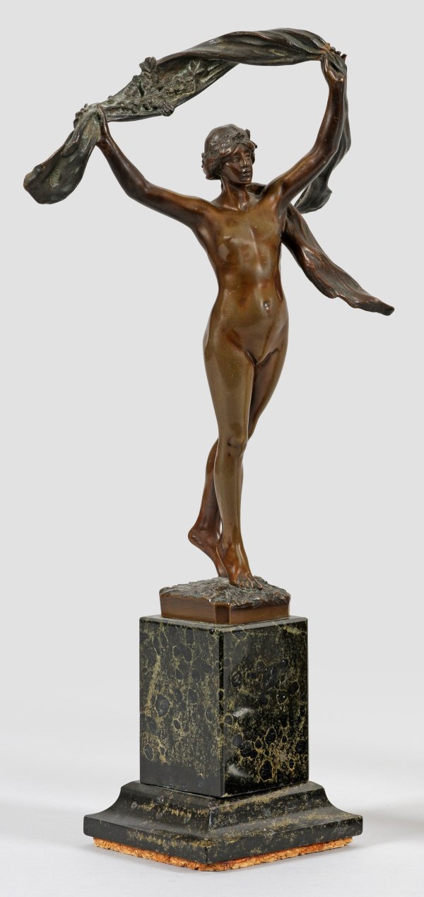 Bronze, dunkelbraun patiniert. Sign.; Gießerinschrift "Akt Gesellschaft Gladenbeck Berlin". Granatserpentinsockel. Bronze-H. 24,5 cm; Ges.-H. 30,5 cm.
