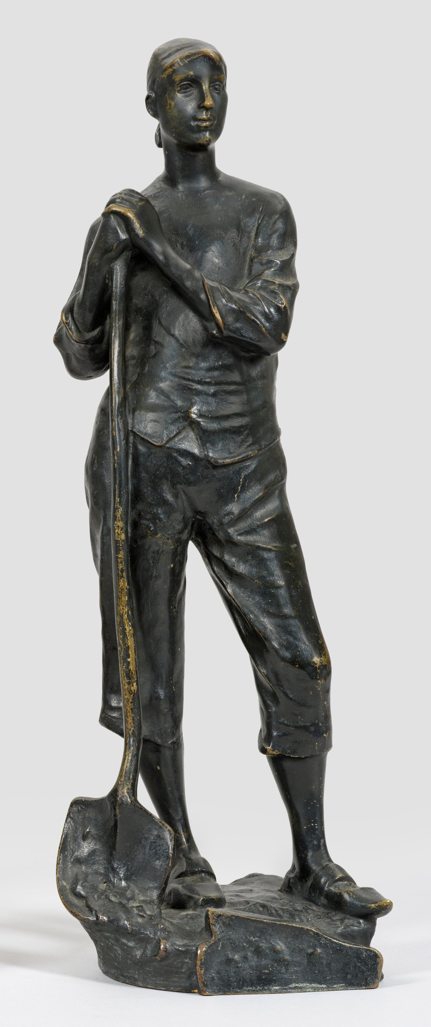 Bronze, schwarz patiniert. Sign.; Vollplastische Statuette eines jugendlichen Bergmädchens in Arbeitskleidung, ihre Hände auf eine Schaufel stützend. Auf das Wesentliche hin formal reduzierte, typische Figur Meuniers mit weich stilisierender Modellierung. Der auch als Maler tätige Künstler gilt als der bedeutendste belgische Bildhauer des 19. Jhs. neben George Minne. Ab 1880 wandte sich Meunier Darstellungen hart arbeitender Menschen, neben Fischern und Bauern insbesondere Bergleuten zu. In mehreren Skulpturen und Gemälden widmete er sich auch dem "Hiercheuse"-Thema - der heute ungewöhnlich wirkenden Tätigkeit junger Frauen - im Bergbau. Patina partiell ber.; H. 46,5 cm.
