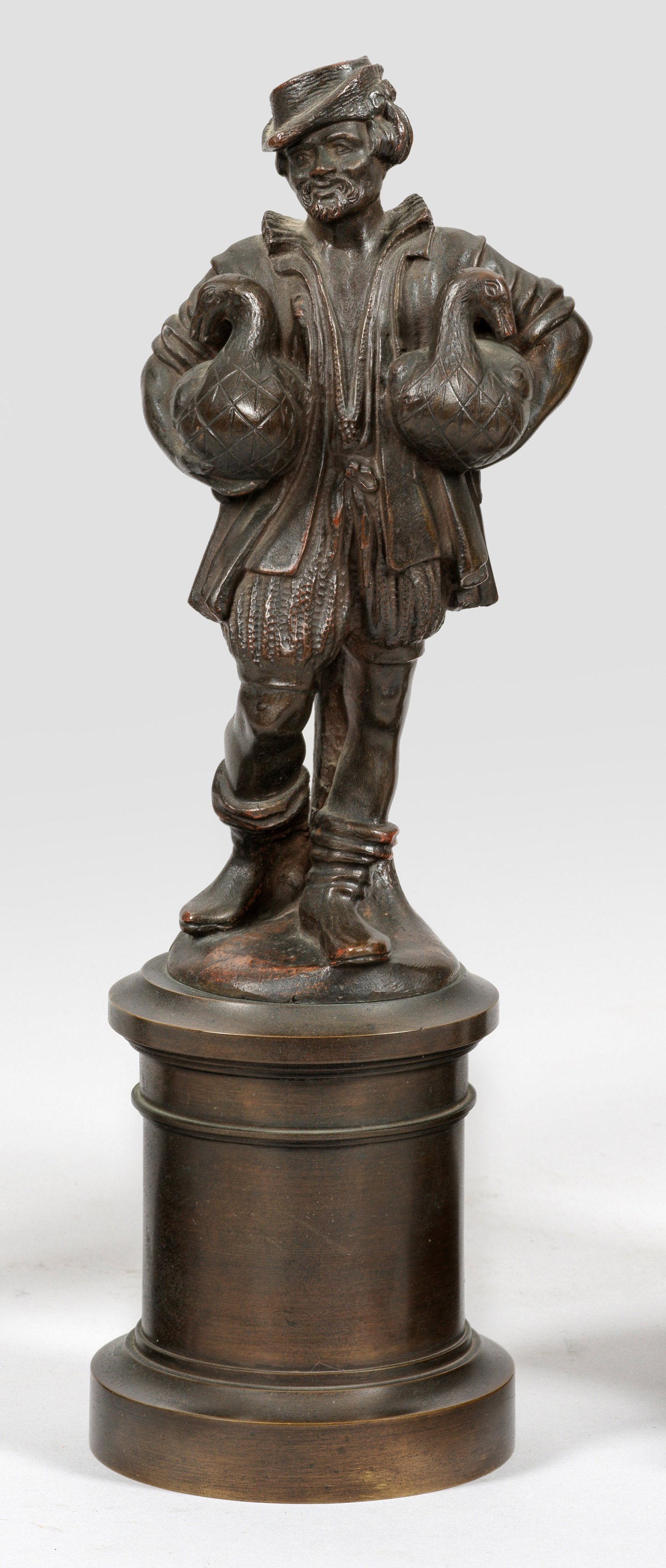 Bronze, dunkelbraun patiniert. Guss des 19./20. Jhs. durch die Kunstgießerei Lenz, Nürnberg (inschriftlich bez. "Lenz"). Stark verkleinerte, im Detail fein ausgeführte Statuette nach den um 1550 geschaffenen "Gänsemännchenbrunnen" in Nürnberg, H. 27,8 cm.