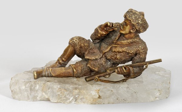 Bronze, braun patiniert; Bergkristall-Plinthe. Vollplastisch gearbeitete, im Detail sehr fein ausgeführte Kleinbronze eines Mannes in traditioneller Tracht- mit Fell-Jacke, -Mütze und -Hose sowie hohen Lederstiefeln. Plinthe ger. best.; Ges.-H. 8,8 cm; B. 16,5 cm.