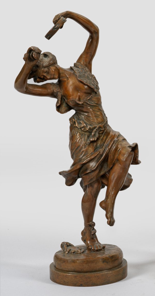 Bronze, dunkelbraun patiniert. Sign.; Auf einer runden Plinthe nur auf einer Fußspitze stehende, graziös posierende Tänzerin in leichtem, tief dekolletiertem Kleid und Fellweste. H. 27 cm.