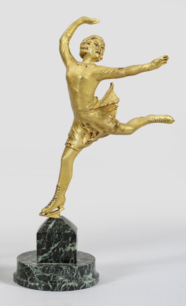 Bronze, vergoldet. Sign.; Dunkelgrünschwarzer, geäderter Marmorsockel. Reizvolle, um 1930-1935 entstandene Art Déco-Figur der berühmten norwegisch-amerikanischen Eiskunstläuferin, die 1928-1936 dreimal Olympia-Gold gewann, 1927-1936 in Folge 10-fache Weltmeisterin war und danach u. a. eine fulminante Karriere in Hollywood begann. Ges.-H. 35 cm.