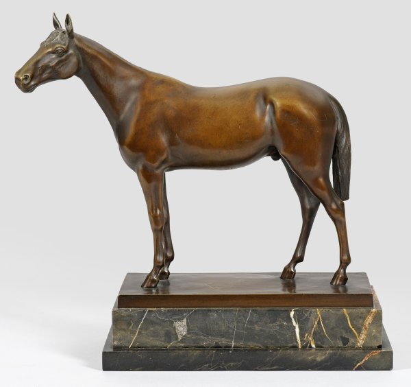 Bronze, braun patiniert. Sign. "F. Richter. fec."; Gießerstempel "Oskar Gladenbeck G.m.b.H.". Dunkelgrauer, hell geäderter Marmorsockel. Vollplastische Pferdestatuette Richter-Elsners, der 1905-1916 künstlerischer Leiter der Gießerei Oscar Gladenbeck & Co. in Berlin-Friedrichshagen war. Ges.-H. 36,7 cm; Ges.-B. 37,5 cm.