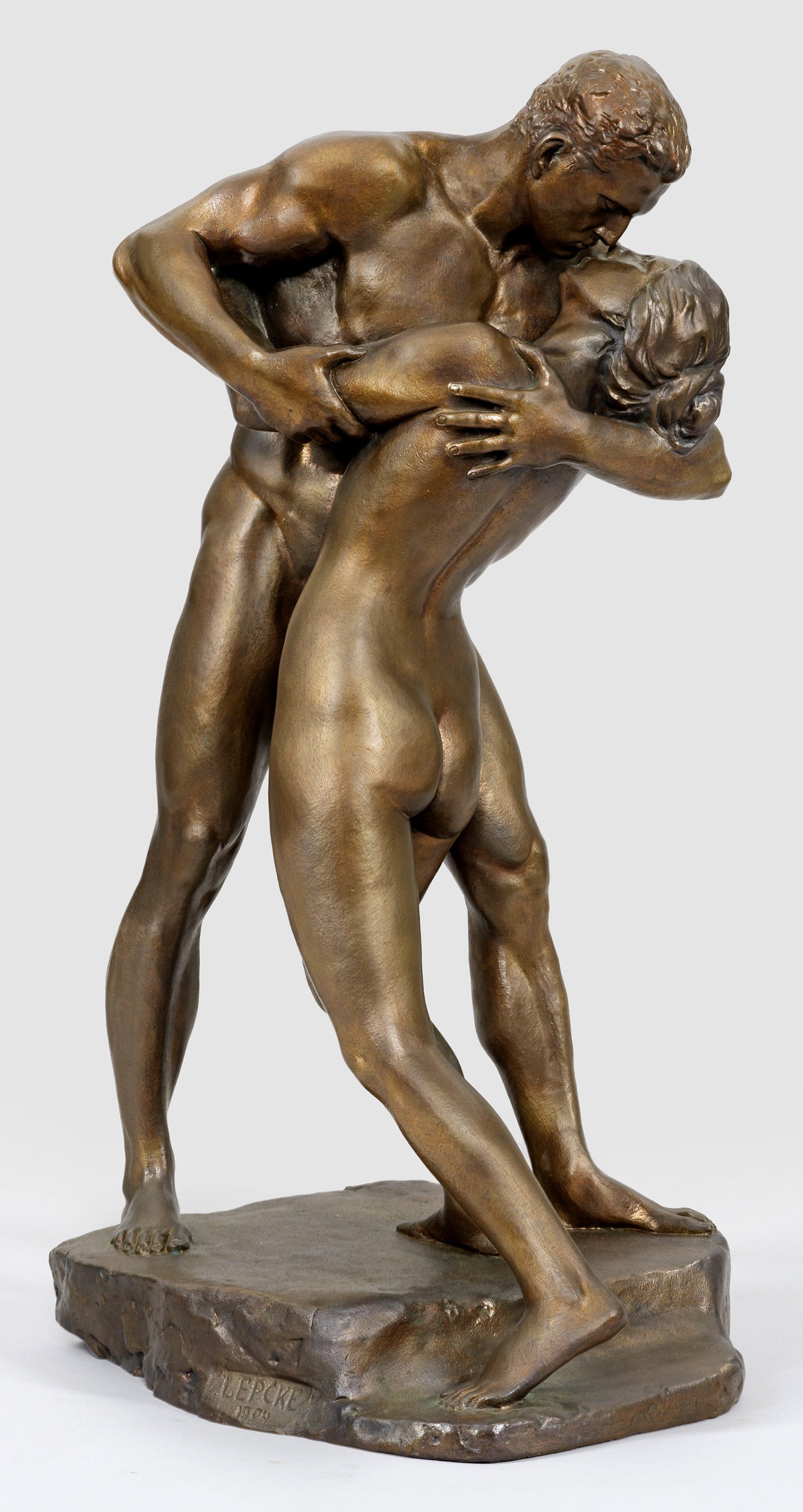 Bronze, dunkelbraun patiniert. Bez. u. dat. 1904. Gießerstempel. Posthumer, zeitgenössischer Guss, Ende 20. Jh.; 1904 zeigte Lepcke das Modell für "Wiedersehen" mit Erfolg in der Großen Berliner Kunstausstellung. Mit diesem, sich innig küssenden Figurenpaar stand Lepcke künstlerisch auf der Höhe seiner Zeit jenseits wilhelminischer Prüderie. Die Plastik wurde in mehreren Größen durch Lauchhammer ausgeführt. Lepcke studierte 1883-1890 an der Berliner Akademie, seit 1888 als Meisterschüler Fritz Schapers. 1903 erhielt er auf der Großen Berliner Kunstausstellung eine Goldmedaille, 1904 auf der Weltausstellung in St. Louis eine Silbermedaille, 1905 den Professorentitel. Bekannt wurde er insbesondere durch Darstellungen weiblicher Akte sowie monumentale Arbeiten wie den 1904 enthüllten "Sintflutbrunnen" in Bromberg (1906 in verkleinerter Version in Coburg). H. 57,5 cm.