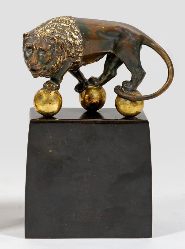 Bronze, dunkel patiniert, teilw. poliert u. vergoldet. Rücks. gravierte Windmungsinschrift "Seiner lieben Lore Weihnachten 1920". Hoher, rechteckiger Postamentsockel, darauf der auf drei golden leuchtenden Kugeln stehende, sich dem Betrachter zuwendende, stilisierte Löwe. H. 24,2 cm.