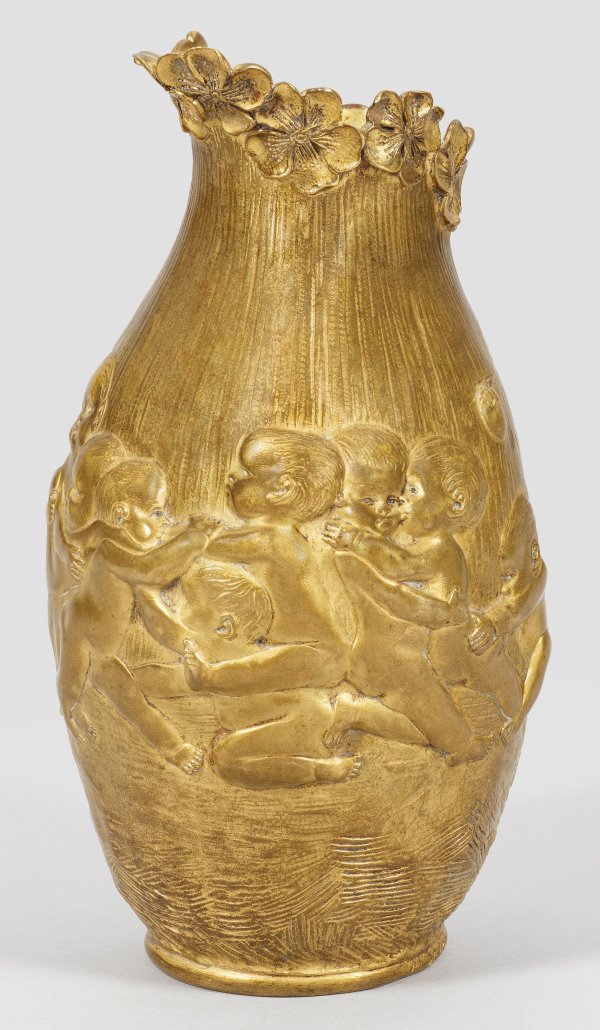 Bronze, vergoldet. Sign.; Gießerstempel "LOUCHET", Paris. Kolbenform, schnabelartige Mündung. Stoltenberg-Lerche wirkte als vielseitiger Bildhauer, Maler und Gestalter für angewandte Kunst in Keramik, Metall und Glas. Er studierte in Neapel und Paris Bildhauerei sowie Malerei bei Ernest Carrière. Seine figurativen Art Nouveau-Gefäße brachten ihm große Bekanntheit. 1900 erhielt er eine Goldmedaille auf der Pariser Weltausstellung, 1902 nahm er an der 1. Internationalen Ausstellung für moderne dekorative Kunst in Turin teil. H. 22,2 cm.