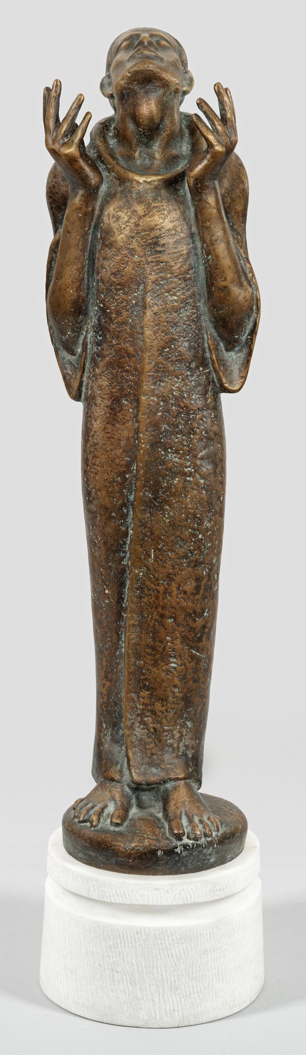 Bronze, dunkelbraun patiniert. Sign. u.dat. "GROVE 1934". Gießerstempel "STRASSACKER KUNSTGUSS SÜSSEN" sowie Dat. (19)92. Weißer, zylindrischer Marmorsockel. Große, expressive, in moderner Weise stilisierte Darstellung eines Mönches, wohl des Hl. Franziskus, in meditativer bzw. adorierender Pose mit hoch zum Himmel gerecktem Kopf, die Hände gestisch neben den Hals haltend. Bronze-H. 87 cm; Ges.-H. 103 cm.