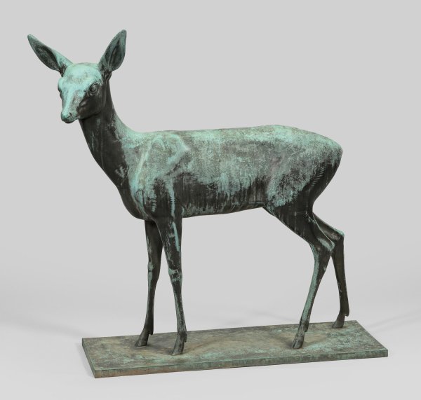 Bronze, patiniert sowie mit gewachsener Patina. Sign. u. dat. 1930. Gießerinschrift "GUSS ALB. BURGAU AUGSBURG-NEUSÄSS". Auf einer flachen, schlichten, rechteckigen Plinthe stehendes Reh mit aufmerksam lauschend erhobenem, leicht nach links gewandtem Kopf. In moderner Weise stilisierte, formal auf das Wesentliche des Tieres, sein Wesen und seine Gestalt konzentrierte Darstellung. Großes, frühes Werk des Künstlers, der als Bildhauer neben Plastiken, Denkmälern und Reliefs eine Reihe von Medaillen schuf, sowohl Darstellungen von Tieren als auch Menschen, Bildnisbüsten etc.; Fahrner absolvierte eine Ausbildung in der Stuttgarter Metallwarenfabrik Mayer und Wilhelm, war sodann in der Stuttgarter Kunstprägeanstalt tätig, bildete sich als Graveur und Präger in Schwäbisch Gmünd aus und kehrte dann nach Freudenstadt als freier Künstler zurück. In den 1930er Jahren war er auch für die Württembergische Metallwarenfabrik in Geislingen an der Steige tätig. 1938 bis 1944 beschickte Fahrner die Große Deutsche Kunstausstellung im Haus der Deutschen Kunst in München mit 20 Werken, darunter 1938 mit der Bronze "Sich leckendes Reh". Das vorliegende, 1930 entstandene Reh von Fahrner steht stilistisch dem im selben Jahr geschaffenen, bekannten "Äsenden Reh" seines Künstlerkollegen Fritz von Graevenitz nahe, was einen Einfluss annehmen lässt. 1936 folgte Fahrner mit einer weiteren "Reh"-Bronze, die von der Staatsgalerie Stuttgart erworben wurde. Ca. 94,5 cm x 100 cm x 29,5 cm.