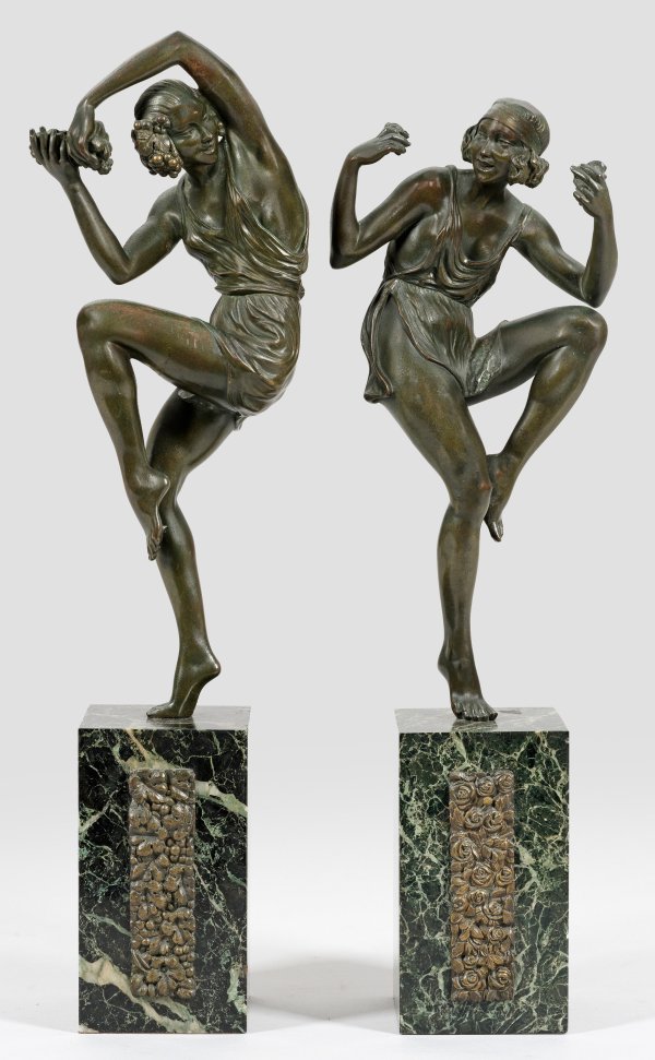 Gegenstücke. Bronze, dunkelgrün u. dunkelbraun patiniert. Grünschwarzer, hell geäderter Marmorsockel. Sign. "Laurel" bzw. "P. Laurel". In graziösen, heiter-beschwingten Posen stehende junge Tänzerinnen in kurzen, leichten Kleidchen mit Blumen bzw. Weintrauben als Attribute der Jahreszeiten. Pierre Le Fugays, einer der bedeutendsten Vertreter des Art Déco in Frankreich, arbeitete auch unter den Pseudonymen Fayral, Laurel und Pierre Laurel. Er studierte an der École des Beaux-Arts in Genf bei James Vibert, zu seinen Künstlerfreunden zählten die beiden Bildhauer Marcel Bouraine und Max Le Verrier, mit denen er auch kooperierte. Ges.-H. 47,5 cm-50,5 cm.