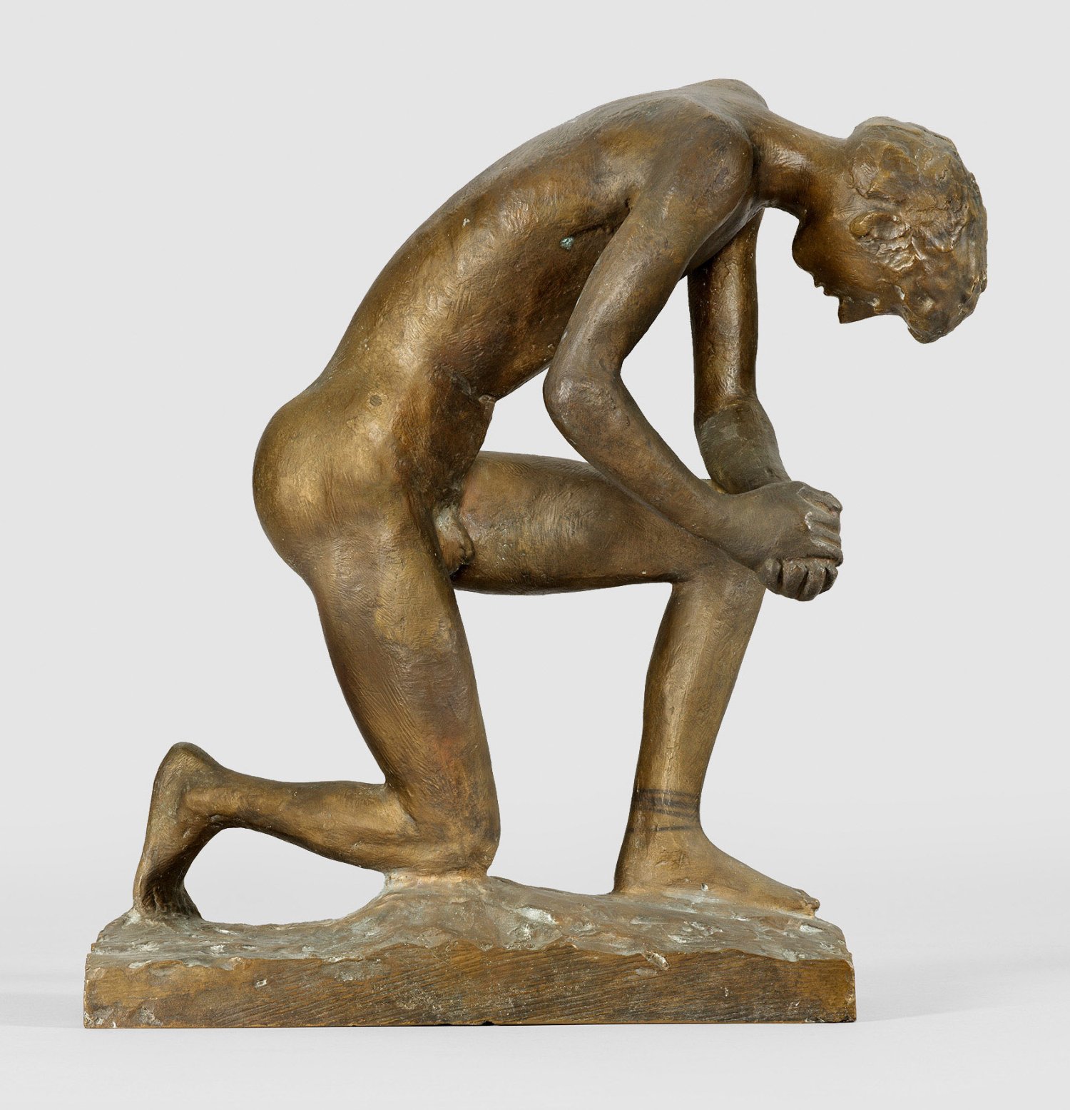 Bronze, dunkelbraun patiniert, 1970. Künstler-Signet ("Phönix"), nummeriert 3/10 Gießerstempel "GUSS BARTH RINTELN". Wvz. Rudloff 957. Auf einer länglichen, unregelmäßigen Plinthe kniende, ruhige Aktfigur eines Jünglings mit vornübergebeugtem, gesenktem Kopf und gefalteten Händen. Das Motiv eines demütig knienden männlichen Aktes bzw. eines Gestürzten findet sich mehrfach im Oeuvre von Marcks, schon in seiner Schaffensphase 1919-1925 als Meister am Weimarer Bauhaus und 1925-1933 an der Kunstschule Burg Giebichenstein ("Werkstätten der Stadt Halle") in Halle/Saale. In dieser späten Bronze gelang es ihm durch formale Reduktion die Haltung und den Ausdruck zu steigern. In der Sammlung des Gerhard Marcks-Hauses in Bremen befindet sich eine Reihe von Zeichnungen als Studien hierfür. H. 39 cm.