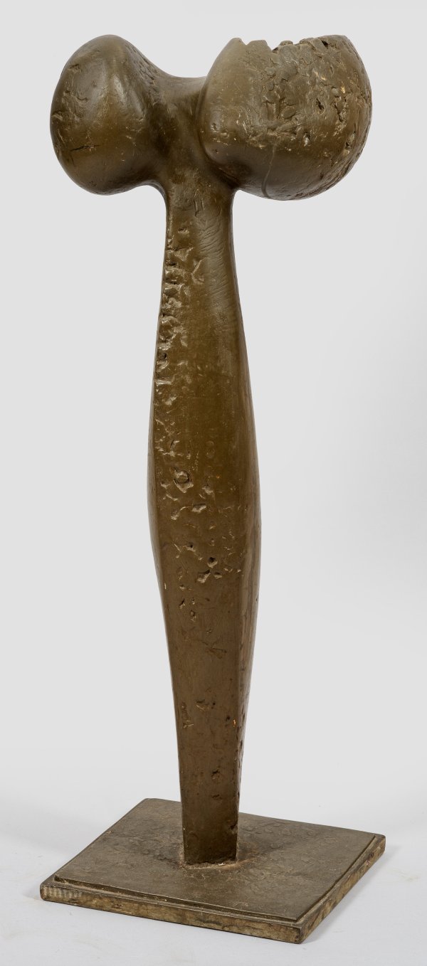 Bozzetto, braun gefasst, 1962. Sign. u. dat. (19)62 mit Ortsangabe "Villa Massimo Roma". Modell für die in drei Exemplaren ausgeführte Bronze; 1963/64 entstand noch eine größere, 213 cm hohe Version als Unikat in Aluminium. Die stelenartige Plastik zwischen Figuration und der Abstraktion eines Torso, bei der das obere Ende Assoziationen an zwei weibliche Brüste hervorruft, entstand während seines Stipendiums in der Villa Massimo in Rom 1962. Bohnet studierte 1946-1950 an der Akademie in Stuttgart, seit 1948 als Meisterschüler von Otto Baum. Im Laufe der 1960er Jahre fand Bohnet mehr und mehr zu objektartigen Skulpturen und seit Ende der 1960er Jahre befasste er sich mit stereometrischen Formen, insbesondere mit der Kugel. H. 99,5 cm.