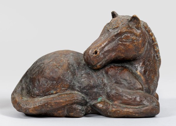 Bronze, dunkelbraun patiniert. In moderner Weise stilisierte, vollplastische Darstellung eines Fohlens mit seitlich gedrehtem Kopf. Nummeriert 1/6, monogr. "N" sowie gest. "A". H. 18 cm.