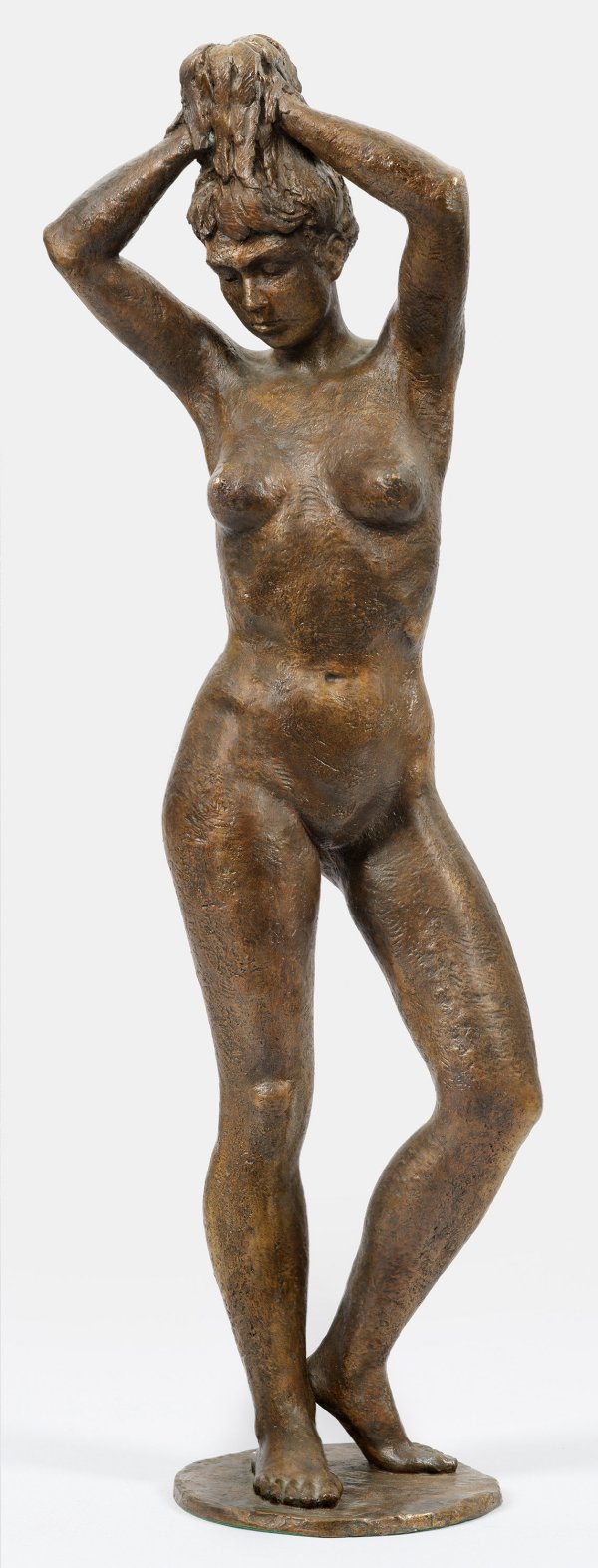 Bronze, dunkelbraun patiniert, 1988. Sign. u. nummeriert 1/9. Gießerstempel "GUSS BARTH RINTELN". Auf einer unregelmäßig runden, flachen Plinthe im starken Kontrapost stehender Akt beim Aufbinden langer Haare. Der auch als Steinmetz ausgebildete Bildhauer Georg Arfmann studierte 1946-1950 an der "Staatlichen Kunstschule" (heute Hochschule für Künste) in Bremen, arbeitete danach freiberuflich, seit 1972 auch als Fachlehrer an der Steinmetz- und Bildhauerschule in Königslutter. Zahlreiche Arbeiten befinden sich im öffentlichen Raum, vorwiegend in Norddeutschland. H. 79 cm.