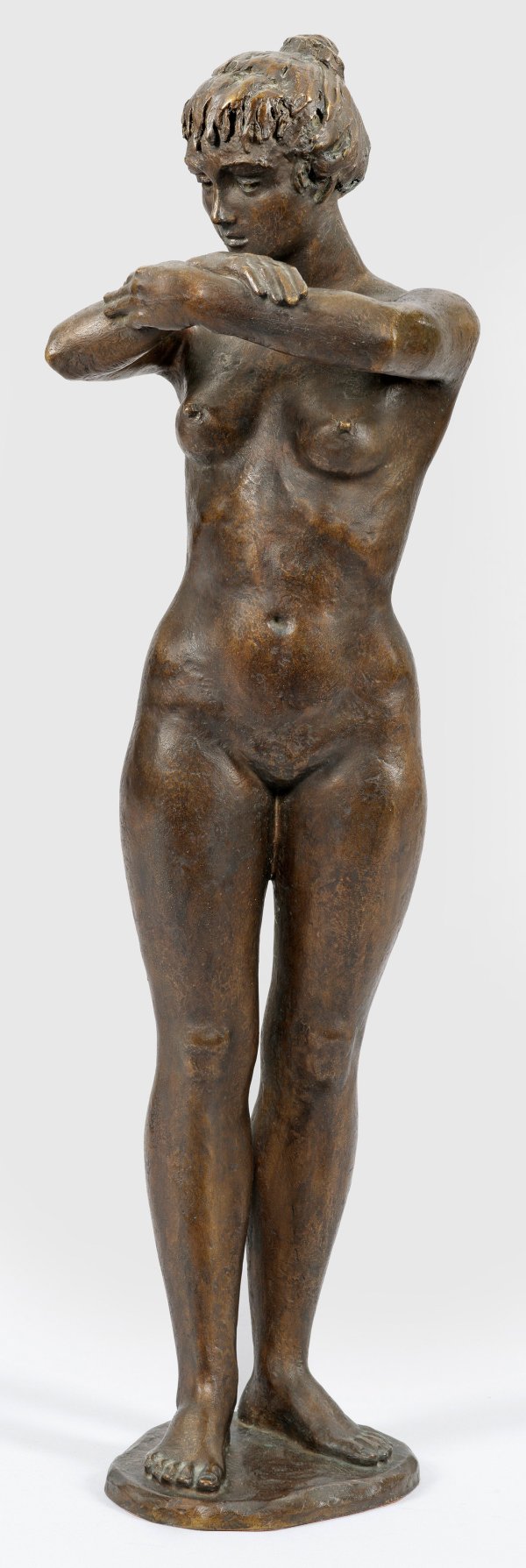 Bronze, dunkelbraun patiniert, 1988. Sign., dat. u. nummeriert 2/9. Gießerstempel "GUSS BARTH RINTELN". Auf einer unregelmäßig ovalen, flachen Plinthe stehender, weiblicher Akt mit zu einem Knoten hochgestecktem, langem Haar und bogenförmig in Schulterhöhe gehaltenen, verschränkten Armen. Der auch als Steinmetz ausgebildete Bildhauer Georg Arfmann studierte 1946-1950 an der "Staatlichen Kunstschule" (heute Hochschule für Künste) in Bremen, arbeitete danach freiberuflich, seit 1972 auch als Fachlehrer an der Steinmetz- und Bildhauerschule in Königslutter. Zahlreiche Arbeiten befinden sich im öffentlichen Raum, vorwiegend in Norddeutschland. H. 67,5 cm.