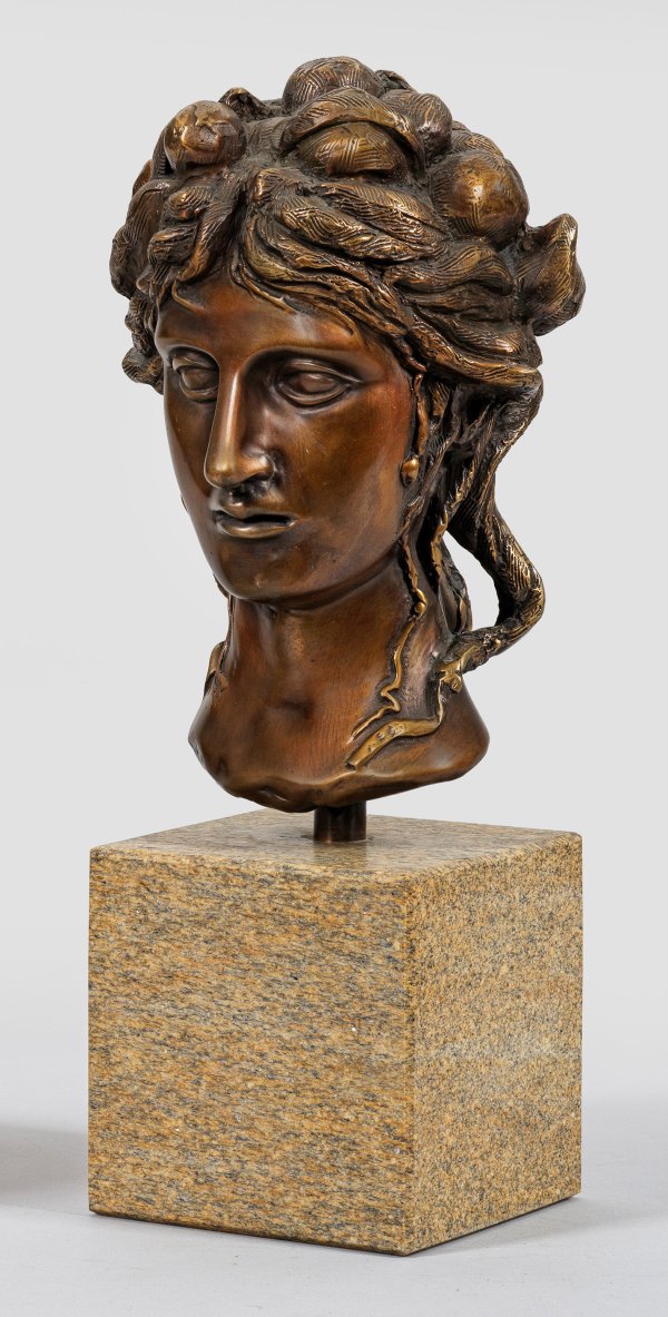 Bronze, dunkelbraun patiniert u. partiell poliert; Granit-Sockel. Signatur-Stempel, nummeriert 4/320, Gießerstempel von ARA Kunst Dr. Fritz Albrecht, Altrandsberg. Durch die Antike und Renaissance inspirierter weiblicher Kopf des vor allem als Maler bekannten Künstlers. Ges-H. 34,5 cm.