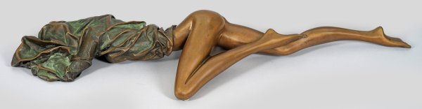 Bronze, partiell poliert, in Grün- und Brauntönen patiniert. Signatur-Stempel, nummeriert 978/1000, Gießerstempel "venturi arte". Liegender, weiblicher Akt in stilisierten, überlängten Proportionen und über den Oberkörper sowie Kopf gezogenem Tuch bzw. Kleid. Ca. 10 cm x 79 cm x 20 cm.