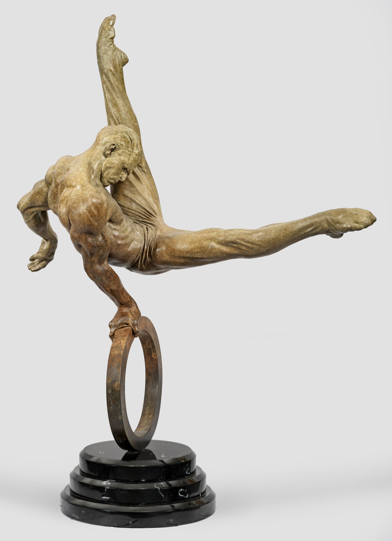 Bronze, in nuancierten, hellen Brauntönen patiniert, 1995. Sign. u. dat. (19)95. Schwarzer, hell geäderter, abgetreppter, runder Mamorsockel. Halblebensgroße Version. Naturalistische Darstellung eines männlichen Turners mit stark definierter Muskulatur, der in höchst energievoller, dynamischer Pose auf einem kleinen Reifen turnt und sich hierbei nur mit einer Hand abstützt. Inspiriert durch den legendären amerikanischen Turner Kurt Thomas, der die Figur als erster auf dem Seitpferd entwickelte. Für die Olympischen Sommerspiele 1996 in Atlanta schuf MacDonald "The Flair" als 26 Fuß (fast 8 m) hohe Skulptur eines Turners, er entwarf zudem den Platz, einschließlich eines großen reflektierenden Pools und eines Brunnens, eingeweiht kurz vor der Eröffnung der Olympischen Spiele. "The Flair" bzw. "Flair Across America" feiert laut eigener Aussage "den Triumph des menschlichen Geistes und die Idealisierung der menschlichen Form". Es hat für ihn eine universelle Botschaft und verkörpert zugleich das olympische Credo des Vaters der modernen Olympischen Spiele, Baron Pierre de Coubertin. Der Künstler brachte sogar olympische Goldmedaillengewinner zusammen, um mit dem Denkmal auf Tour zu gehen, darunter Kurt Thomas, der die Turnbewegung namens "The Flair" populär machte. Ges.-H. 130,5 cm.