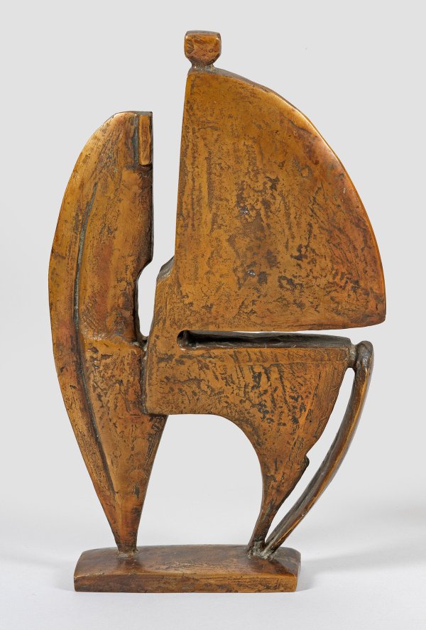 Bronze, dunkelbraun patiniert. Sign. mit Monogramm "HRoH" u. nummeriert 1/8. Moderne, kubistisch stilisierte Arbeit des Bildhauers, der 1954-1963 an der Werkkunstschule in Hannover, Akademie in Stuttgart und École Nationale Supérieure Des Beaux-Arts in Paris studierte, bevor er dauerhaft in Stuttgart ansässig wurde. 36,5 cm x 21,5 cm x 5 cm.