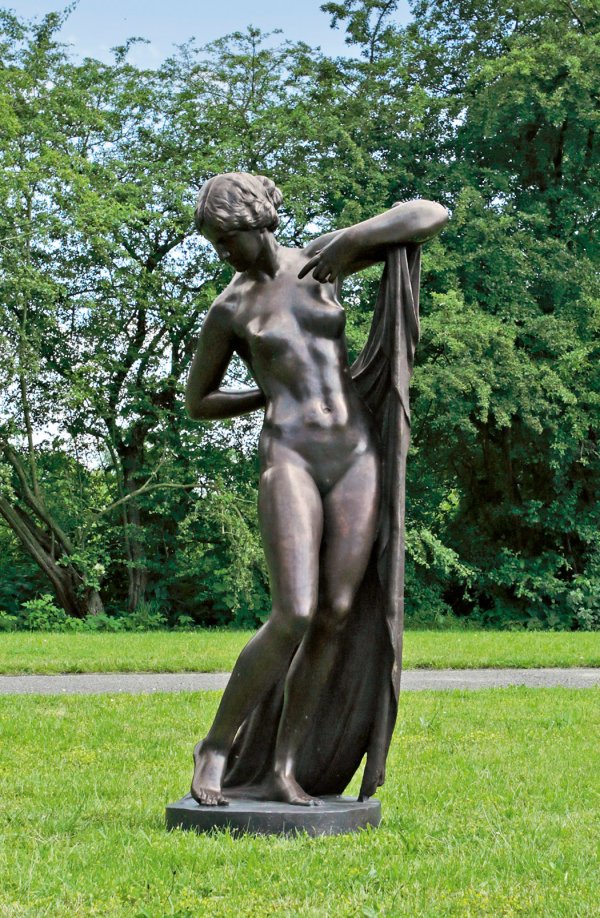 Bronze, dunkel patiniert. Posthumer Guss, Lauchhammer, 20 Jh.; Auf einer runden Plinthe stehende Aktfigur der griechischen Hetäre, sich ein Tuch umlegend. Die überlebensgroße, idealisierende Figur der "Phryne" gilt als eines der bedeutendsten Werke Lepckes. 1883-1890 studierte er an der Berliner Akademie, ab 1888 als Meisterschüler Fritz Schapers. 1891 zeichnete ihn die Preußische Akademie der Künste mit dem großen Staatspreis aus, der mit einem Stipendienjahr 1892/93 in Rom verbunden war. Von der 1907/08 modellierten, 1908 sowie 1909 auf den Großen Berliner Kunstausstellungen gezeigten "Phryne" existieren mehrere Lebzeitgüsse als Freiskulpturen in Parks und Plätzen bzw. in öffentlichem Besitz, u.a. in Berlin und Coburg. Nach dem Tod des Künstlers verkaufte sein Bruder zahlreiche Modelle Lepckes an die Kunstgießerei Lauchhammer, die entscheidend zur weiteren Bekanntheit des Bildhauers beitrug. H. ca. 185 cm.
