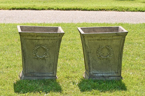 Grauer Steinguss. Über quadratischem Profilsockel sich konisch weitender Korpus, zweiseitig mit erhaben reliefierten Lorbeerkränzen. H. 52 cm. 44 cm x 44 cm.