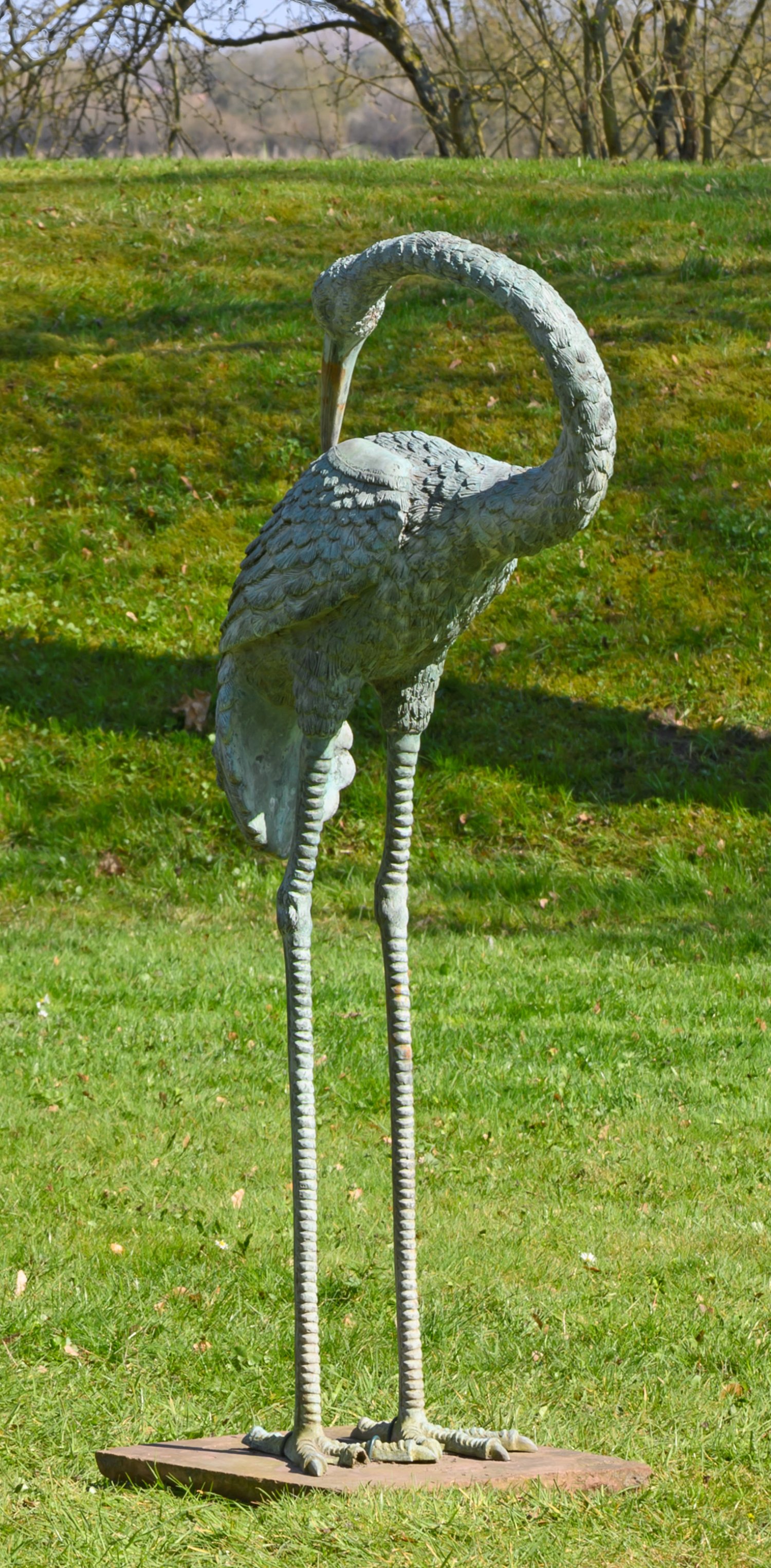 Bronze, hellgrün patiniert. Montiert auf quadratischer Sandsteinplatte. Große vollplastische Darstellung eines Kranichs mit sich nach hinten umwendendem Kopf. Ein Zeh besch.; Ges.-H. 128 cm.