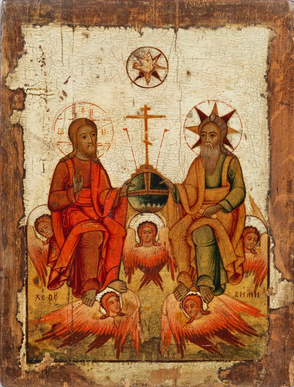 Tempera auf Holz. Kowtscheg. 2 rücks. Sponki. Im leicht vertieftem Mittelfeld sitzender Gottvater, mit weißem Haupt- und Barthaar und Christus als junger Mann auf einer Wolkenbank, die von Cherubim getragen wird, den göttlichen Begleitern, die von Gottes Gegenwart kündigen. Im Zentrum halten Vater und Sohn einen prächtigen Reichsapfel als Zeichen Ihrer Allmacht, darüber schwebt der Heilige Geist in Gestalt einer weißen Taube. Die Heilige Dreifaltigkeit gilt als die grundlegende und wichtigste Lehre der christlichen Kirchen. In ihr vereint sind Gott der Vater als der Schöpfer des Himmels und der Erde, Jesus Christus, der als Botschafter zu den Menschen entsandt wird, und der Heilige Geist, der den Jüngern Jesu zuteil wird, damit diese die offenbarten Wahrheiten verstehen und bezeugen. Kirchenslawisch bez.; 42 cm x 31,5 cm x 2,5 cm.