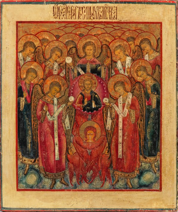Tempera und Gold auf Holz. Darstellung einer Synaxis von zahlreichen Engeln, die sich um den im Zentrum abgebildeten Erzengel Michael versammeln vor dem zwei Engel eine Aureole mit dem Brustbild Jesus Christi präsentieren, das von Seraphim getragen wird. Kirchenslawisch bez.; 36 cm x 30,5 cm x 4 cm.