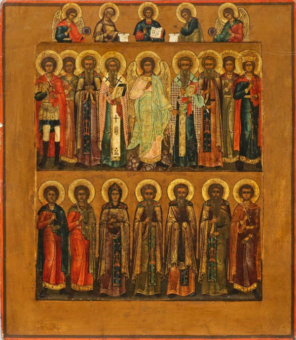 A fine Russian icon of the deisis, the guardian angel and selected patron saints. Tempera and gold on wood.