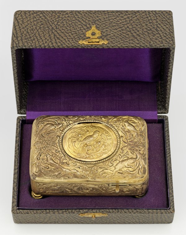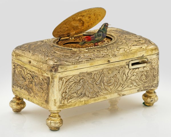 in originaler Box. Silber, voll vergoldet. Rechteckige Form mit abgerundeten Ecken und Kanten auf vier Balusterfüßen. Wandung flächendeckend verziert mit reliefiertem Rankendekor, Vogeldarstellungen, einem Fuchs und einem Wildschwein. Auf der Oberseite scharnierter, ovaler Deckel mit Darstellung eines Vogels, umgeben von Rosenblüten und Blattvoluten. Innen beweglicher Singvogel mit farbigem Gefieder über floral durchbrochen gearbeitetem Grund. Frontaler Hebel zum Auslösen der Spieluhr. Auf der Bodenunterseite Aufzug. Mit Schlüssel aus Messing. Gest. 800, Herstellerzeichen. Gew. ca. 380 g. H. 5,2 cm. 10 cm x 6 cm.