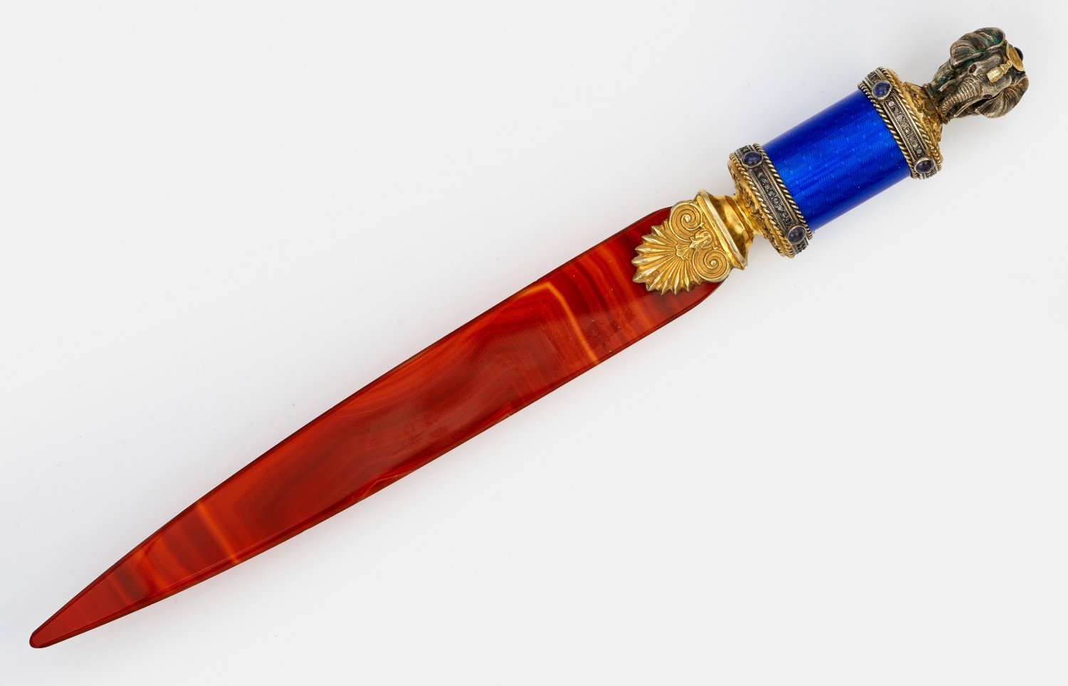 im Stil von Karl Fabergé. Silber, teilw. vergoldet. Klinge aus rötlich gebändertem Achat mit blattähnlicher Montierung. Zylindrischer Griff mit royalblau emailliertem und streifenförmig guillochiertem Grund. Gesäumt von Kordelbanddekor und Diamantrosenfriesen. Als Abschlussknauf ein vollplastisch gestalteter, mit Farbsteinen besetzter Elefant. Gest. 88. Gew. ca. 95 g. L. 23,5 cm.