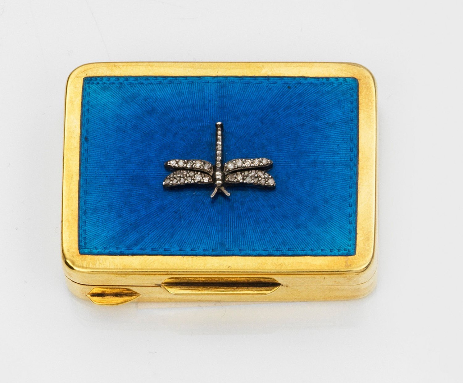 im Stil von Karl Fabergé. Silber, vergoldet und emailliert. Rechteckige Form mit gerundeten Ecken und Scharnierdeckel. Deckel strahlenförmig guillochiert und blau emailliert. Zentral appliziert eine kleine Libelle ausgefasst mit Diamantrosen. Gest. 84. Gew. ca. 35 g. H. 1,6 cm. 3,4 cm x 4,7 cm.