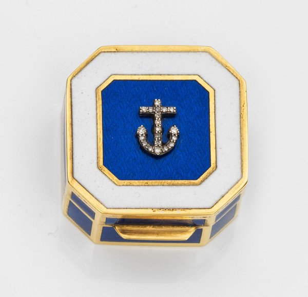 im Stil von Karl Fabergé. Silber, vergoldet und emailliert. Quadratischer Korpus mit gekanteten Ecken. Scharnierter Deckel, zentral besetzt mit kleinem, appliziertem Anker, ausgefasst mit Diamantrosen über royalblau emailliertem und guillochiertem Grund. Umlaufend weiß emaillierter Rahmen mit goldener Profillinie. Gest. 88. Gew. ca. 35 g. H. 2 cm. 3,2 cm x 3,2 cm.