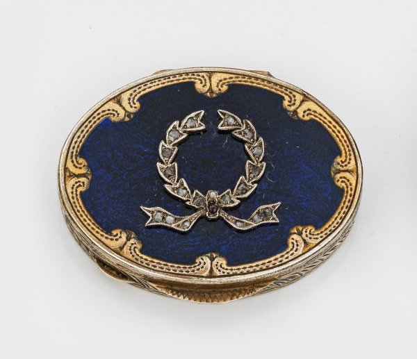 im Stil von Karl Fabergé. Silber, teilw. vergoldet und emailliert. Ovaler Korpus mit flachem, blau emailliertem Scharnierdeckel. Zentral applizierter Lorbeerkranz mit einer Schleife gebunden, ausgefasst mit kleinen Diamantrosen und rotem Farbsteincabochon gerahmt von acht C-Schwüngen. Wandung und Bodenunterseite fein und üppig graviert mit Blattbordüren. Gest. 84. Gew. ca. 25 g. H. 1,5 cm. 4,9 cm x 3,6 cm.