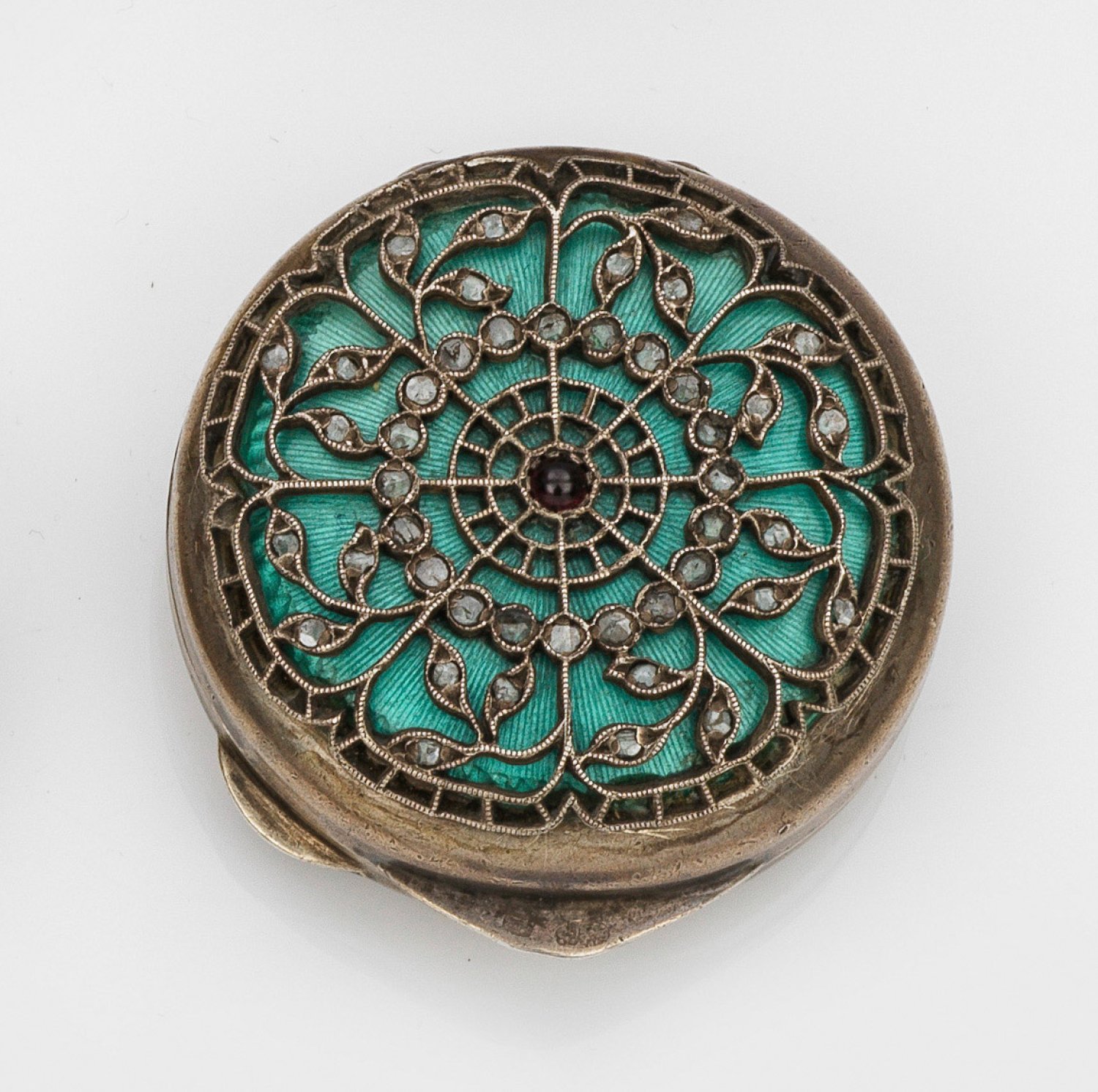 im Stil von Karl Fabergé. Silber, teilw. emailliert. Runde Form mit leicht eingezogener Wandung. Über strahlenförmig guillochiertem und türkisfarben emailliertem Grund ein filigran durchbrochen gearbeitetes, reliefplastisches Netz aus stilisierten Blättern mit Diamantrosen und einem Granatcabochon besetzt. Gest. Kokoschnik 88. Gew. ca. 35 g. H. 1,8 cm. D 4 cm.