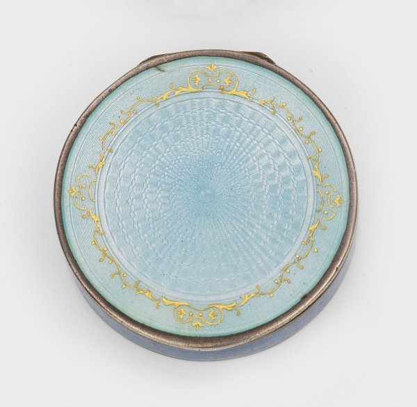 im Stil von Karl Fabergé. Silber, teilw. emailliert. Runde Form mit flachem Deckel. Deckel weiß emailliert und strahlenförmig guillochiert, gerahmt von umlaufendem, goldenem Volutenkranz. Die Wandung hellblau emailliert. Deckel innen vergoldet. Gest. 84 sowie 925. Gew. ca. 60 g. H. 1 cm. D. 4,3 cm.