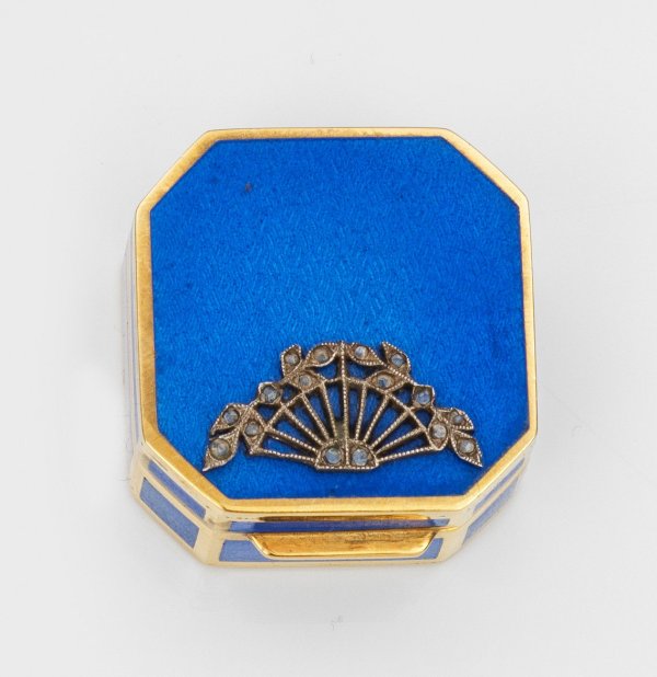 im Stil von Karl Fabergé. Silber, vergoldet und emailliert. Quadratische Form mit geschrägten Ecken und Scharnierdeckel. Deckel mit Applikation eines blättergesäumten Fächers, ausgefasst mit kleinen Diamantrosen, auf blau emailliertem und guillochiertem Grund. Gew. ca. 50 g. H. 2,2 cm, 3,3 cm x 3,3 cm.