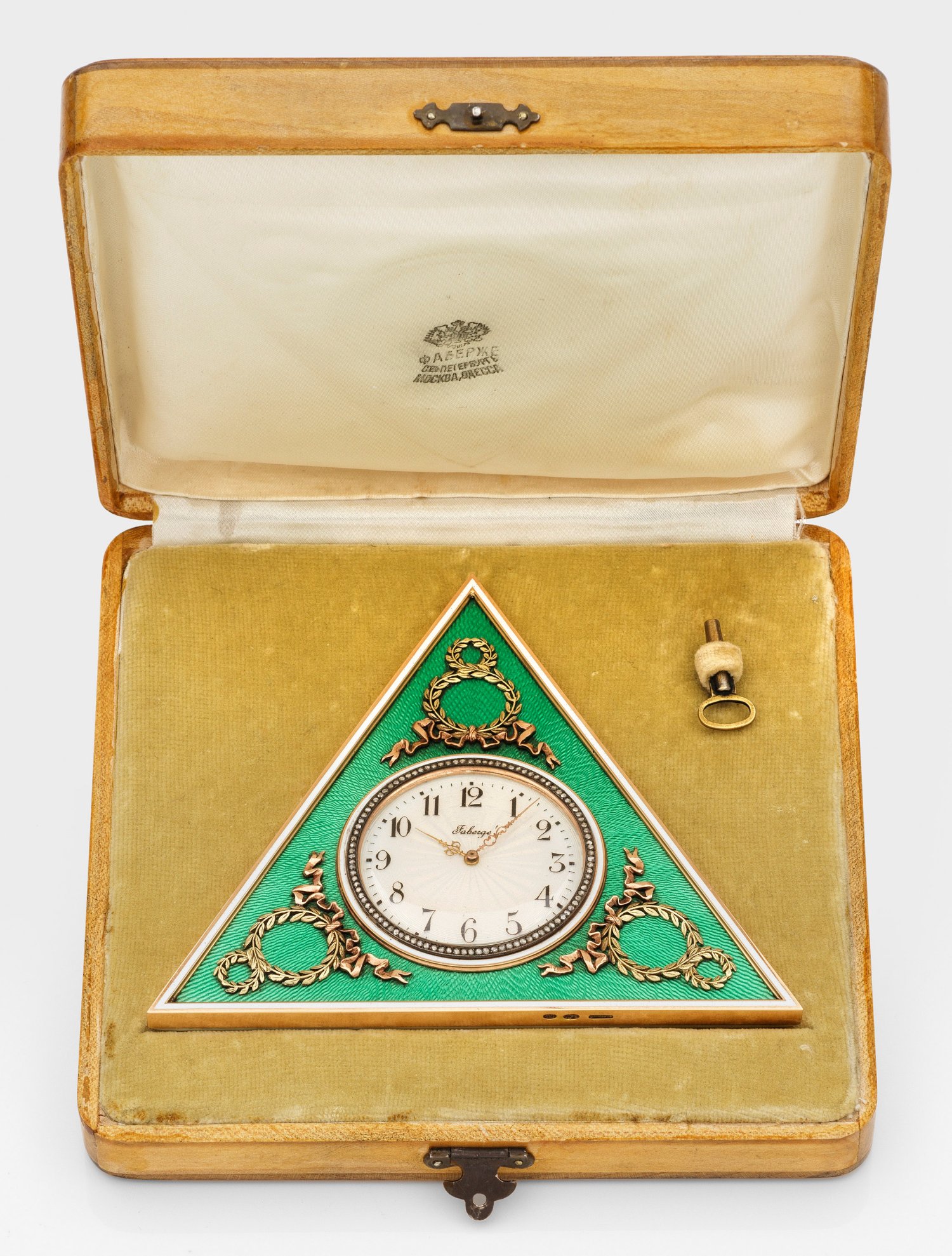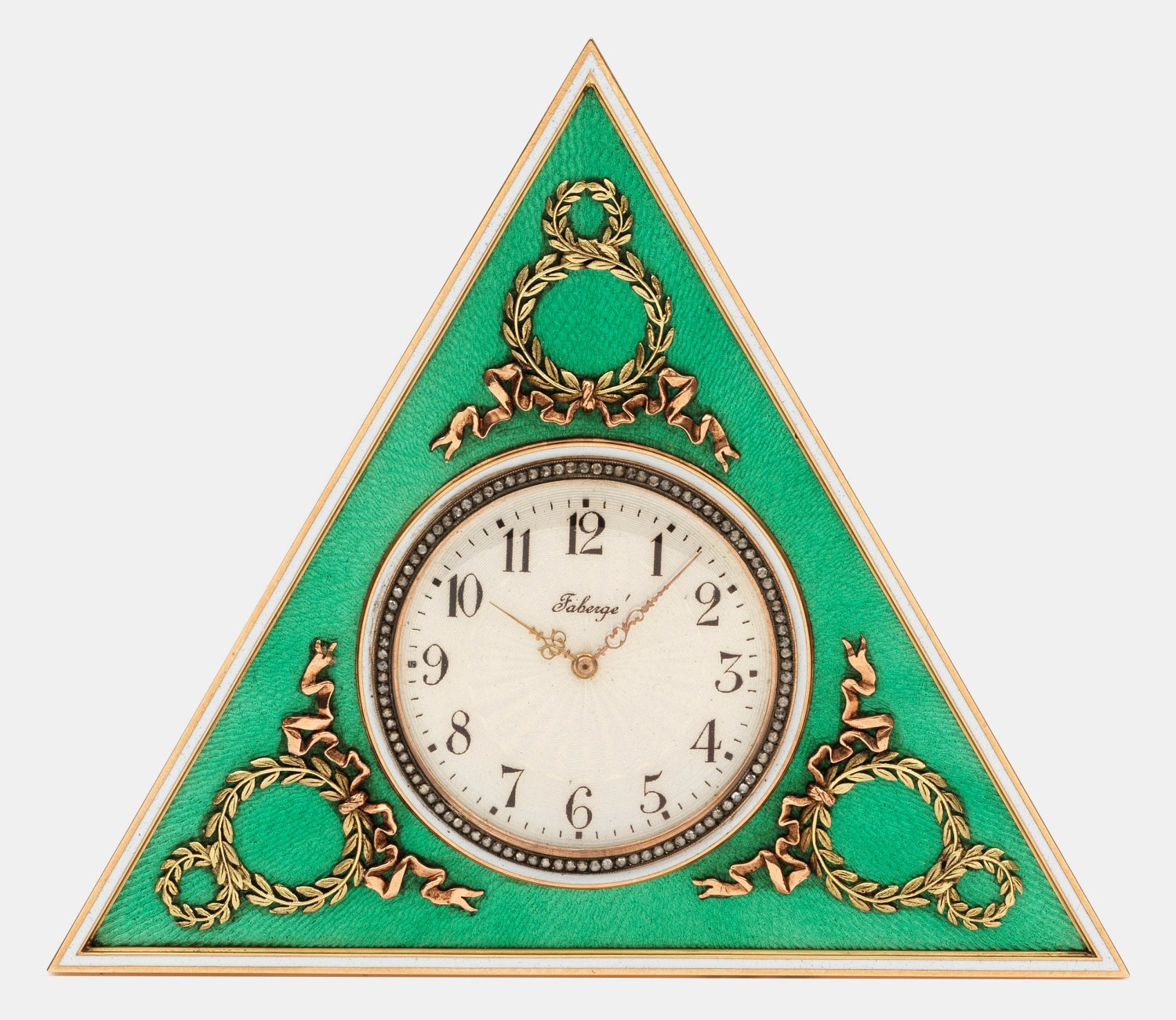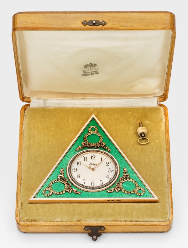 im Stil von Karl Fabergé. Silber, vergoldet und teilw. emailliert, Gold. Dreieckige Schauseite. Zentral eingelassene Uhr mit guillochiertem, weiß emailliertem Ziffernblatt mit arabischen Zahlen und vergoldeter, mit Diamantrosen besetzter Lünette, umgeben von grün emailliertem und wellenförmig guillochiertem Grund. Die Ecken verziert mit applizierten zu Achten gewundenen Lorbeerzweigen und Schleifenbändern. Lünette und Schauseite profiliert mit schmalen, weiß emaillierten Rahmen. Rücks. Aufsteller und Aufzug. Zifferblatt bez. "Faberge". Schlüssel. Originalbox. Gest. 56, 88. H. 10,5 cm.