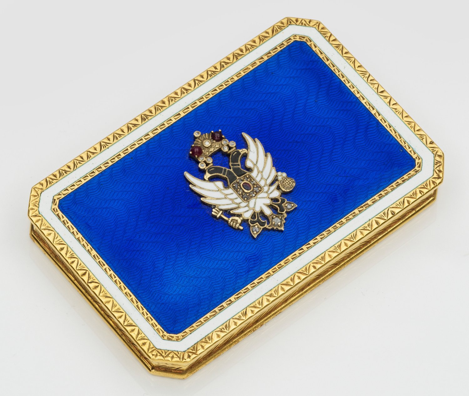 im Stil von Karl Fabergé. Mit Etui. Silber, voll vergoldet. Rechteckige Form mit abgeschrägten Ecken. Auf dem Deckel applizierter Doppeladler ausgefasst mit Diamantrosen und Granatcabochons über königsblau emailliertem Grund und umzogen von opak-weißem Band. Wandung und Unterseite verziert mit ziseliertem und guillochiertem Lineardekor. Gest. 88. Gew. ca. 205 g. H. 1 cm. 9,7 cm x 6,5 cm.