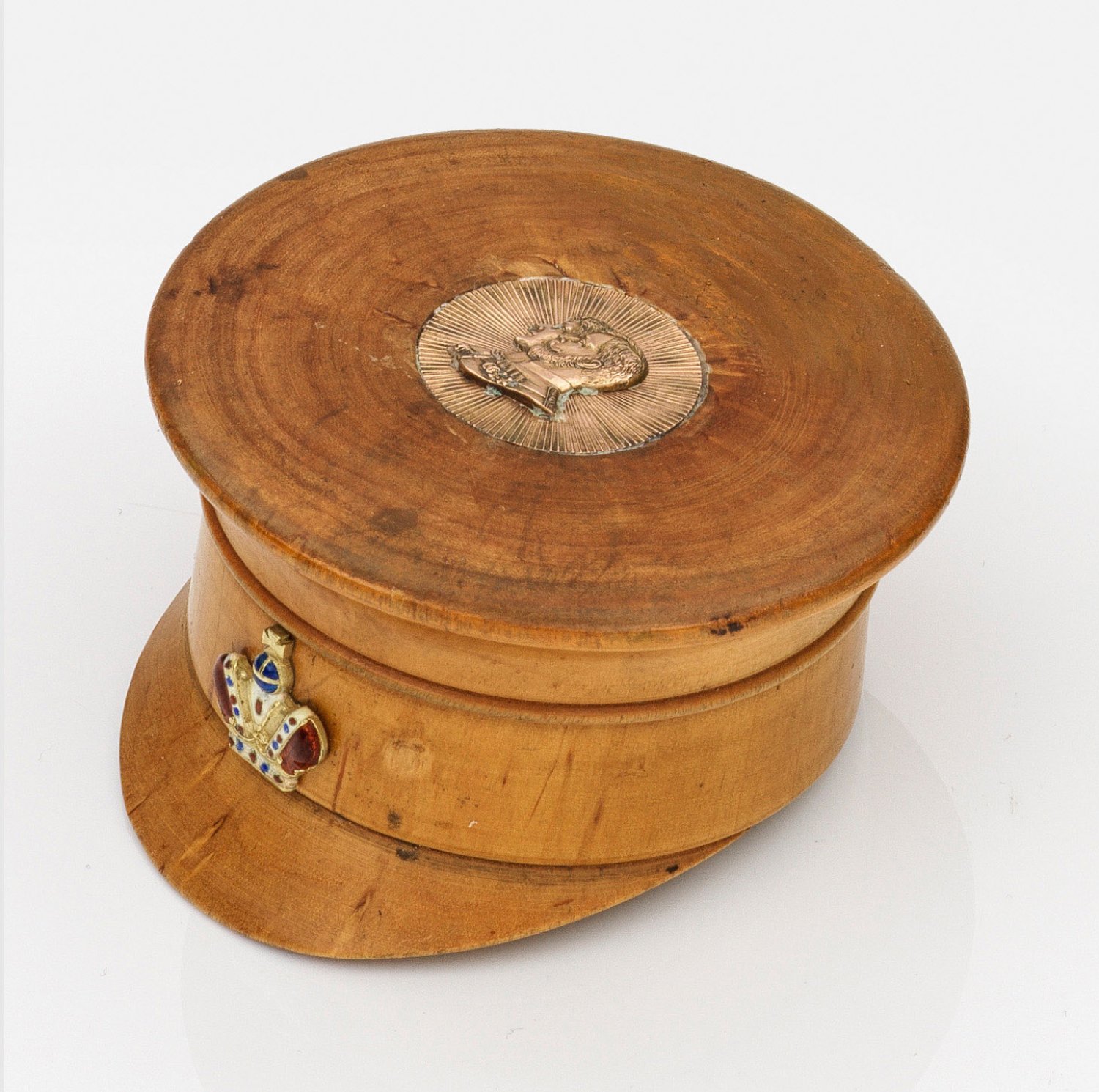 in Form einer russischen Offiziersschirmmütze. Karelische Birke. Schauseitig applizierte und fein polychrom emaillierte Zarenkrone. Zentral im Deckel eingelassene, runde Plakette aus Rotgold mit Profildarstellung des Zaren Nikolaus II. und seiner Gemahlin Alexandra Fjodorowna, umzogen von strahlenförmigem Reliefdekor. Auf der Deckelinnenseite ligiertes, bekröntes kyrillisches Monogramm, gerahmt von wehenden Bändern. Dosenunterseite mit geritzter Jahreszahl "1904" sowie Reste eines alten Etiketts. H. 3,7 cm. D. 6,3 cm.