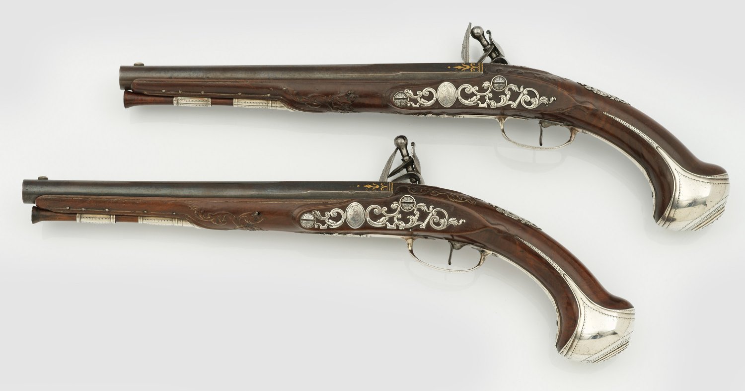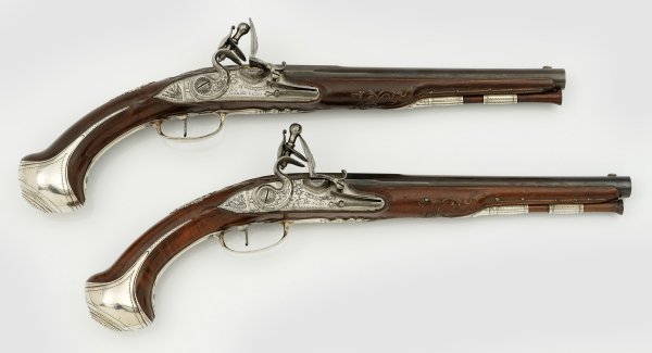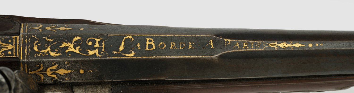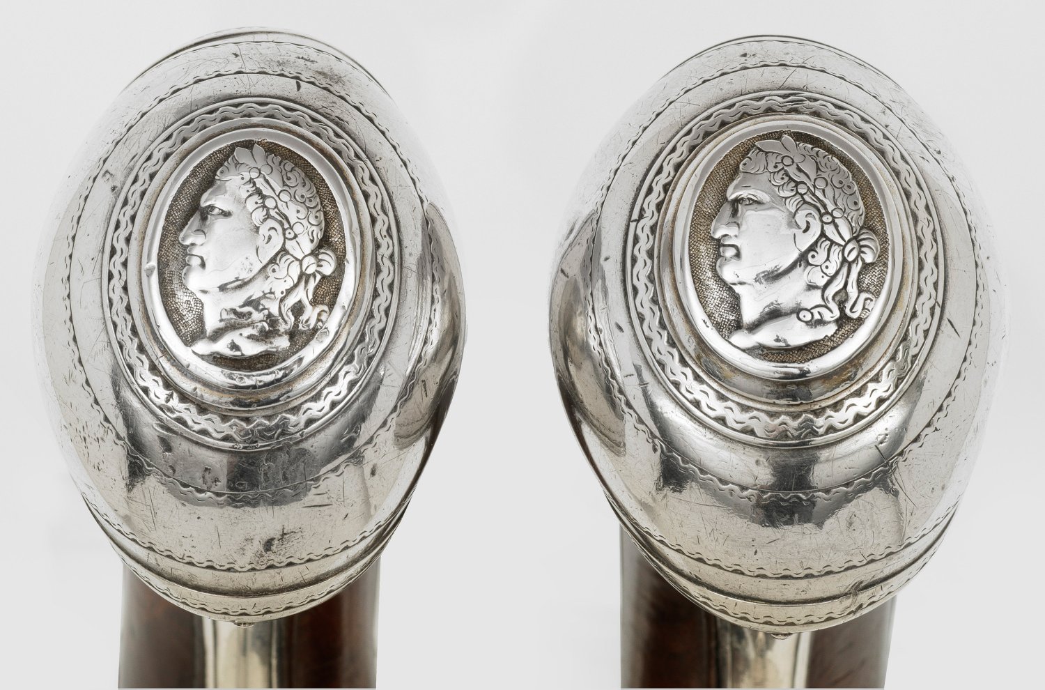 Nussbaumvollschäftung mit fein geschnitzten Blattranken und Maskaronen. Oktogonaler, in Rund übergehender Eisenlauf mit goldtauschierter Signatur "Laborde a Paris". Schlossplatten aus Eisen jeweils korrespondierend sign. "Laborde a Paris" und verziert mit Triumphbündeln sowie einer Eberhatz bzw. zwei Jagdhunden und einem Hasen. Floral geschnittene, volutierte und durchbrochen gearbeitete Gegenplatte und Garnitur aus Silber. Hölzerner Ladestock. Oberhalb des Kolbens applizierte, stilisiert bekrönte Wappenkartusche mit steigendem Löwen, flankiert von zwei Hermen aus Silber. Knauf und Gegenplatte je verziert mit ovalem Medaillon mit Darstellung eines römischen Herrschers im Profil. Länge 43 cm.