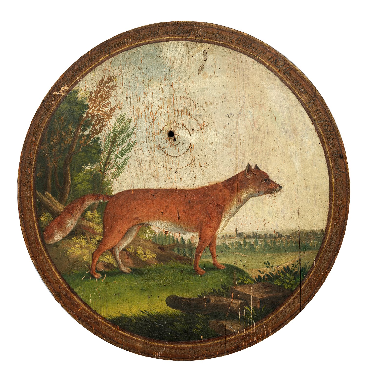 Nadelholz. Schauseitige Darstellung eines Fuchses vor weiter, baumbestandener Landschaft mit Blick auf ein Dorf im Hintergrund. Oberhalb teilw. undeutl. bez. sowie dat. "... Johann Nepomuk Kölbel von Geising, den 20. Aug. 1824 um 3/4 auf 6 Uhr...". Polychrome Malerei. D. 62,5 cm.