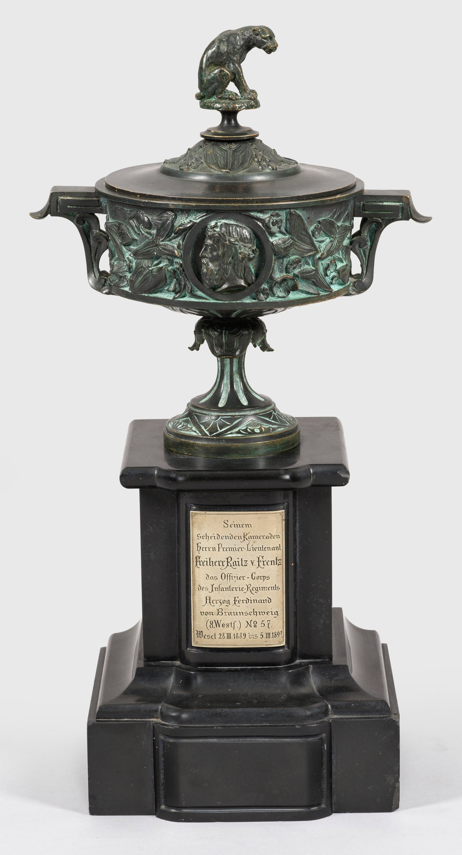 Schwarz patinierte Bronze mit Reliefdekor, figürlicher Tierknauf, Sockel aus geschliffenem und poliertem, schwarzem Stein. Schauseitig montierte und gravierte Silberplakette mit Widmung "Seinem (/) scheidenden Kameraden (/) Freiherr Raitz von Frentz (/) das Offiziers-Corps (/) des Infanterie-Regiments (/) Herzog Ferdinand (/) von Braunschweig (8. Westf.) No. 57 (/) Wesel 28.III.1889 bis 5.III.1897". Sockel ger. best.; H. 37,5 cm.