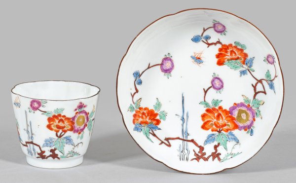 mit Unterschale. Über dem Rundstand kelchförmig sich erweiternder, faconnierter Korpus. Umlaufend der Wandung und im Spiegel Wurzelwerk mit blühenden Päonienstauden und aufrecht wachsenden Bambusstangen sowie fliegendem Insekt. Polychrome Aufglasurmalerei mit kapuzinerbrauner Kontur und wenig Gold. Minim. rest.; H. 6,5 cm.