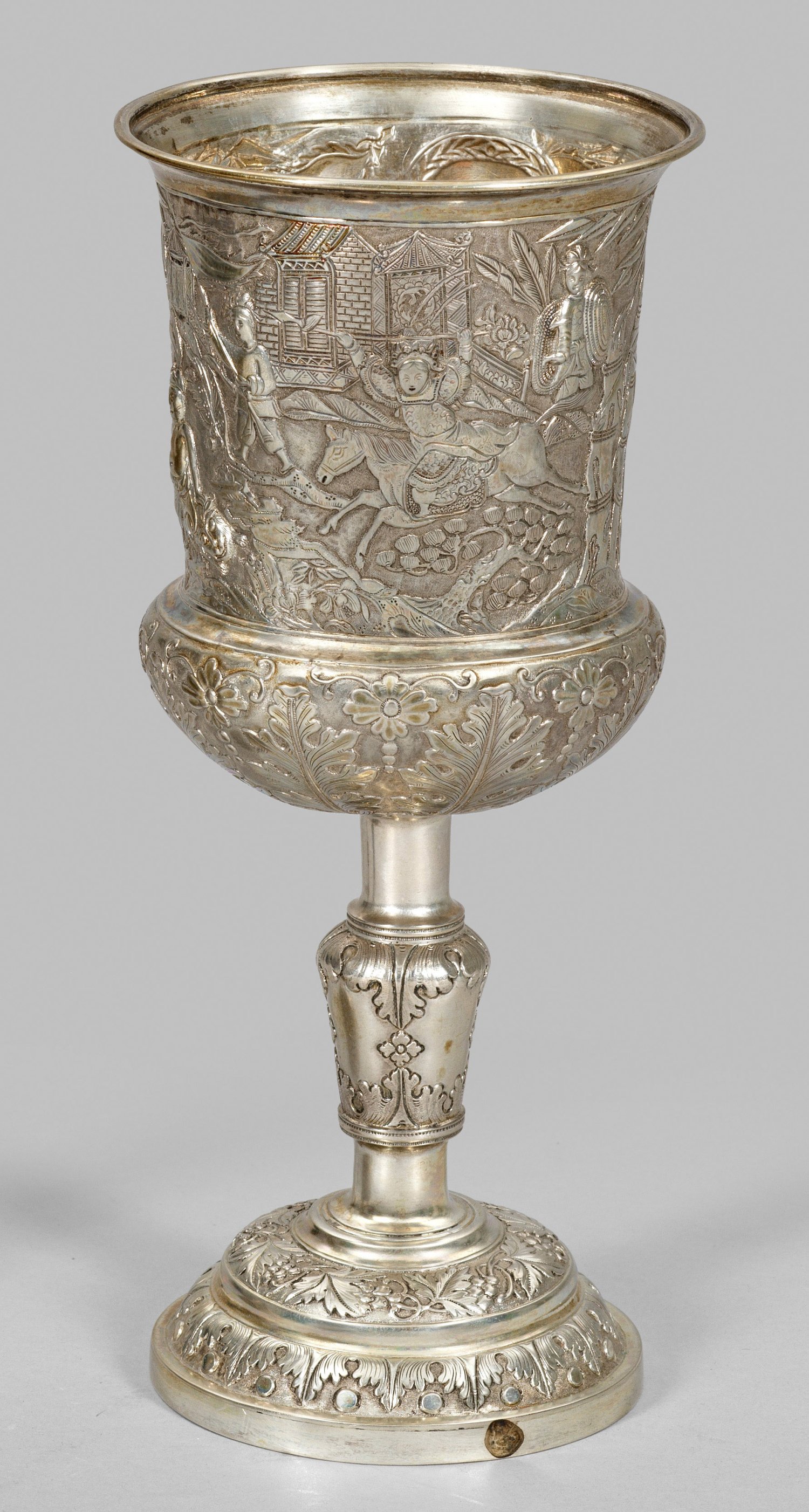Silber. Aufgewölbter Rundstand mit kurzem Balusterschaft. Gebauchte Kuppa. Korpus verziert mit Blättern, Blüten und Weinranken. Obere Kuppawandung umzogen von szenischer Darstellung mit bewaffneten Reitern in traditionellen, chinesischen Gewändern, gerahmt von Bambuspflanzen. Kartusche mit graviertem "S". Innen vergoldet. Gest., englische Pseudomarken, Herstellermarke "HC". Gew. ca. 305 g. H. 20,8 cm.