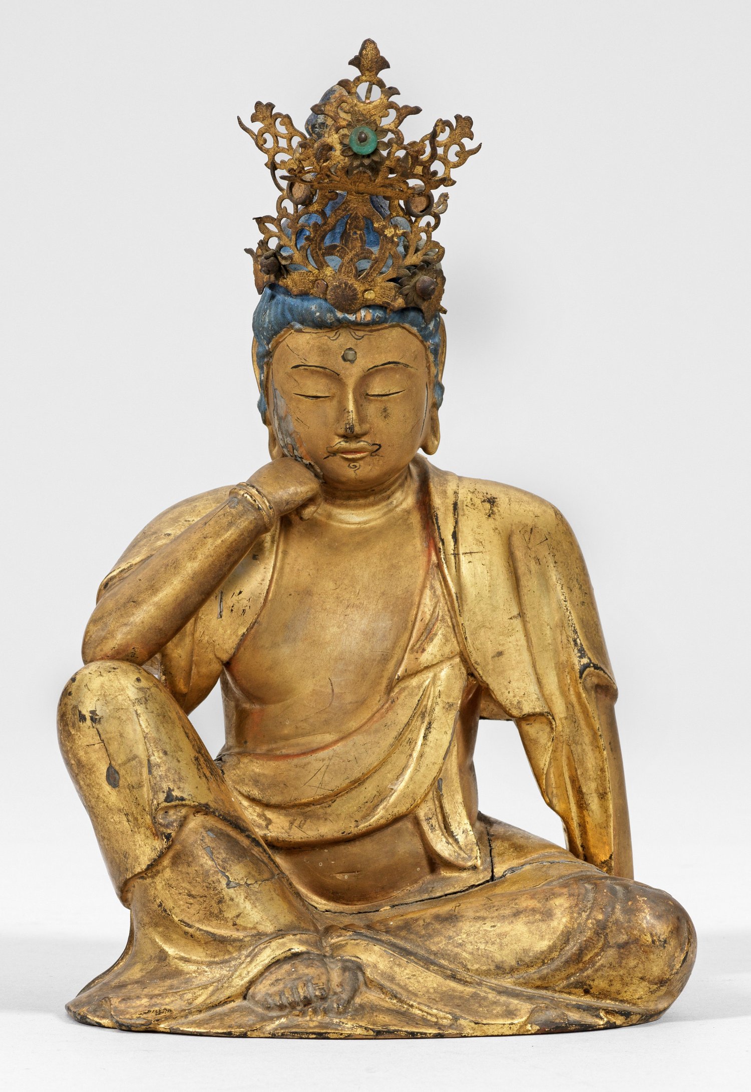 Nadelholz, Metall. teilw. vergoldet. Vollplastische, in Yosegizukuri-Technik (zusammengesetzter Block) gefertigte Figur des sitzenden Nyoirin Kannon, in der Haltung von Rajalilasana (königliche Gelassenheit) dargestellt. Den linken Arm geerdet, das rechte Knie erhoben, den Unterarm stützend, wobei die rechte Wange sanft auf den Knöcheln der Hand ruht. Das locker über die Schultern drapierte Gewand, in Falten über den Schoß fließend, das Haupt bekrönt von einer durchbrochen gearbeiteten, mit Glasperlen besetzten Krone, die halb geschlossenen Augen aus hintermaltem Glas. Auf der Unterseite Reste eines alten Etiketts mit der Nr. 22. Minim. besch.; H. 22 cm.