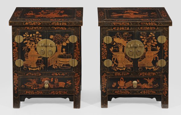 Flächendeckender Lackfond mit Golddekor. Gerader, hochrechteckiger Korpus auf gekanteten Füßen. In der gegliederten Front Schubfach sowie zwei Türen mit Vasenmotiven. Kräftige Deckplatte. H. 72 cm. 57 cm x 42 cm.