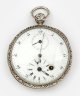 Silber. Halboffenes Gehäuse mit reliefierter Lünette und Architekturgravur. Weißes Emailzifferblatt mit dezentraler, römischer Stundenanzeige, Datumsanzeige und zentralem Minutenzähler mit arabischen Indexen, gebläute Zeiger. Vergoldetes Vollplatinenwerk mit Kette und Schnecke, dreiarmiger Messingunruh und Schlüsselaufzug. Platine sign. und mit Werk-Nr. 130. D. 58 mm. Gew. ca. 111,27 g.