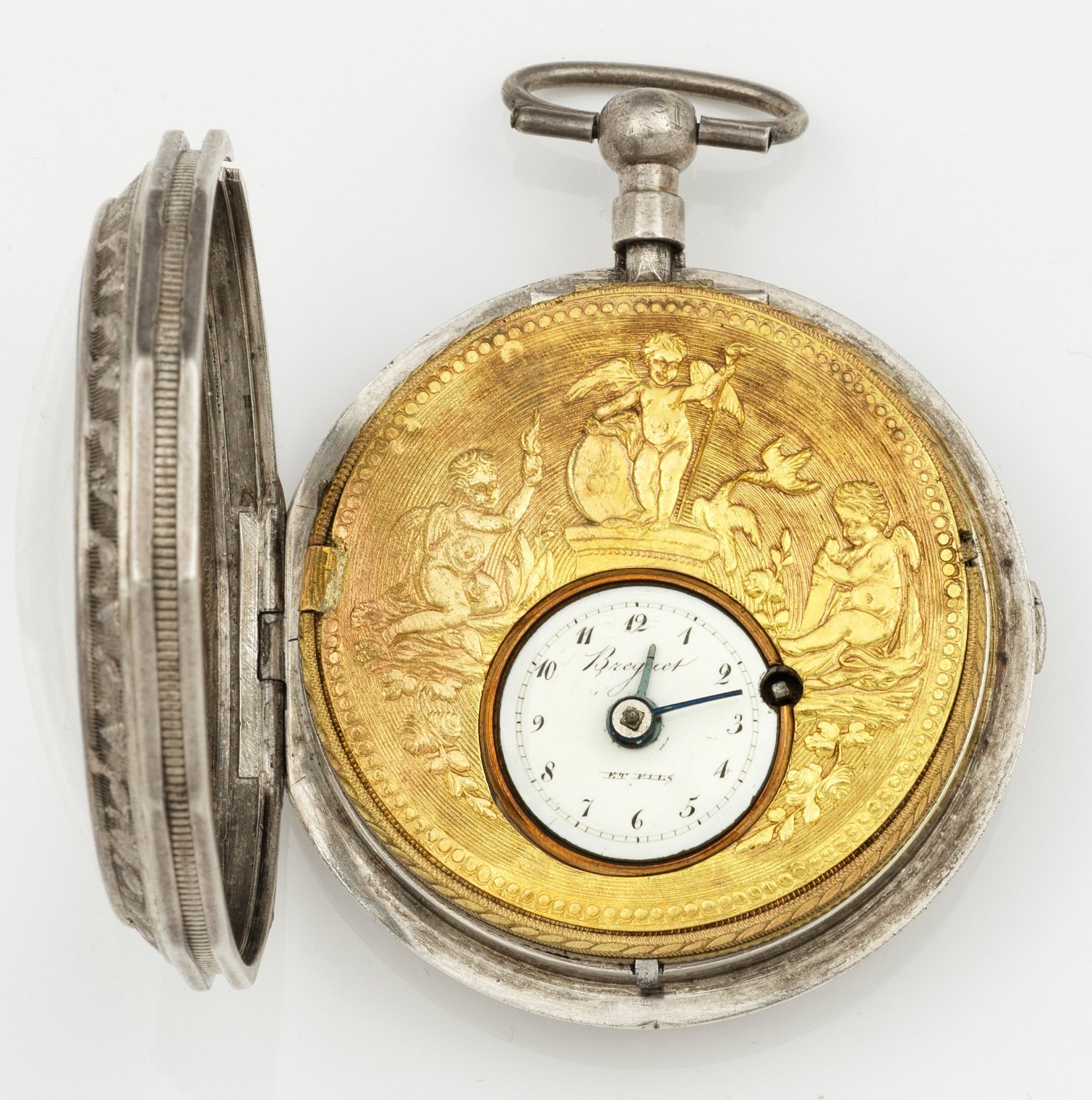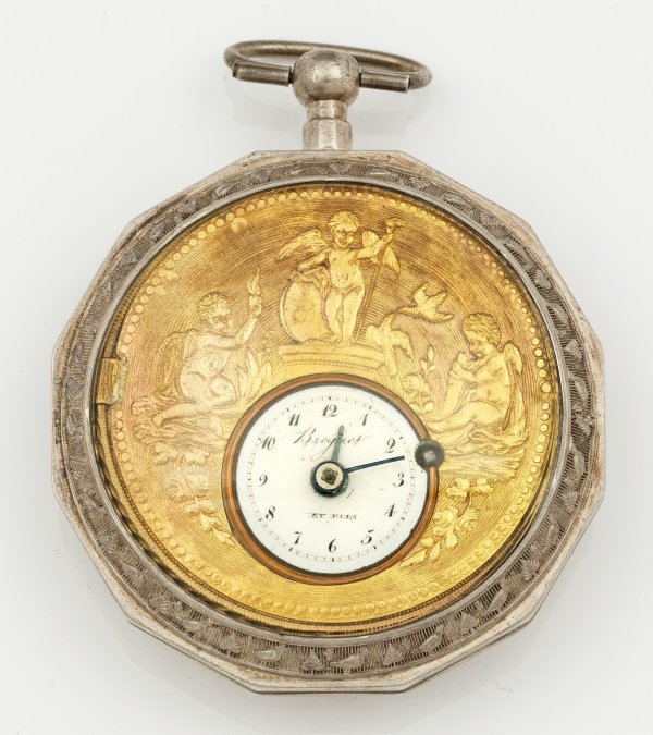 Um 1820. Gekantetes Silbergehäuse, Lünette mit erhabenem Reliefdekor aus Tannenbäumen und Vögeln. Scharnierte Goldabdeckung mit getriebenem Puttendekor, darunter erotische Szene in feiner Emailstaffage. Weißes Emailzifferblatt mit arabischen Indexen, gebläuten Zeigern und Bez. "Breguet et Fils". Vergoldetes Werk mit Schlüsselaufzug, Schnecke, Kette u. dreiarmiger Messingunruh. Platine bez. "Breguet et Fils". Nr. 58478. D. ca. 59 mm. Gew. 114,72 g.