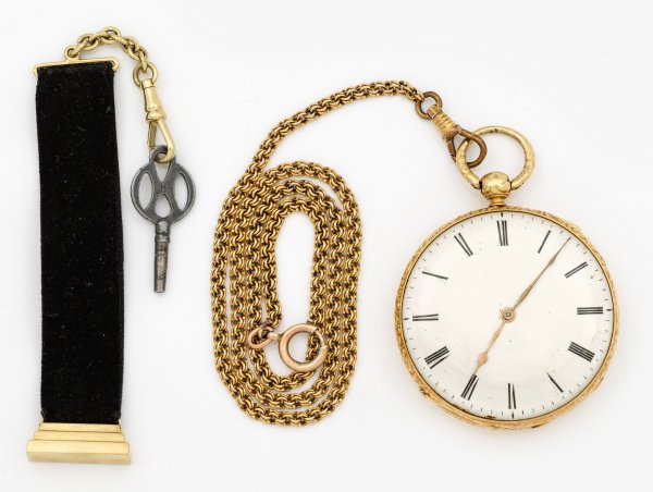 Schweiz. La Chaux-de-Fonds. Um 1850. Gelbgold, 14 k. Offenes, guillochiertes Gehäuse. Gravierte Goldcuvette mit Herstellersignet. Weißes Emailzifferblatt mit römischen Indexen und vergoldeten Birnzeigern. Vergoldetes Brückenwerk mit Schlüsselaufzug, Kompensationsunruh mit Breguetspirale und Ankerhemmung sowie Repetition (Tonfeder). Werk-Nr. 39575. Schatulle, Uhrenkette und Schlüssel an kurzem, schhwarzem Samtband. D. 48 mm. Ges.-Gew. ca. 85,76 g.